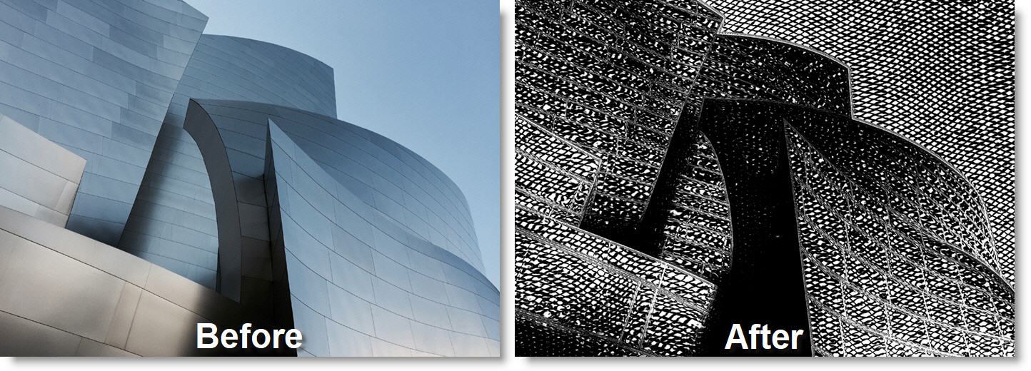 Generates a version of the image using two sets of black and white lines of varying thickness to give an etching or lithograph look.