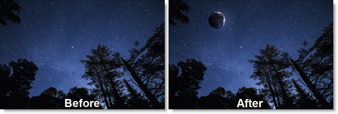 Uses an Overlay blend mode to composite the moon over the image.
