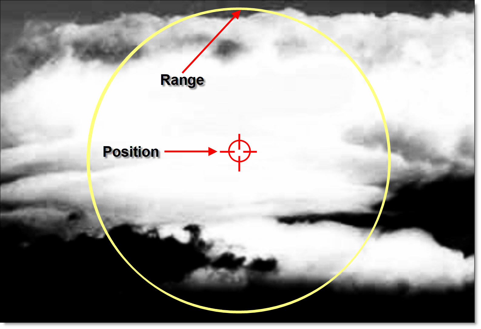 When using the Selection Mask, the Position, Range and Radius parameters can be set using on-screen controls. Click on the image to place the on-screen control which consists of a center point and a solid circle. The Position value is set by the location of the center point, while the Range is set by sizing the circle. The larger the circle, the larger the range. If Radius is used, a dashed circle will also appear.