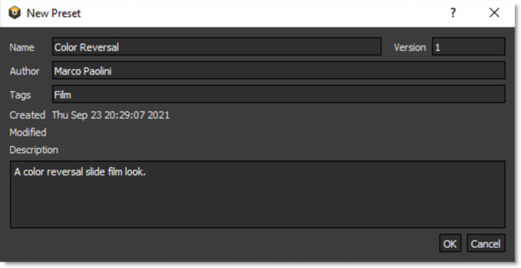 4 When the New Preset window opens, enter the desired information and press OK to create the preset.