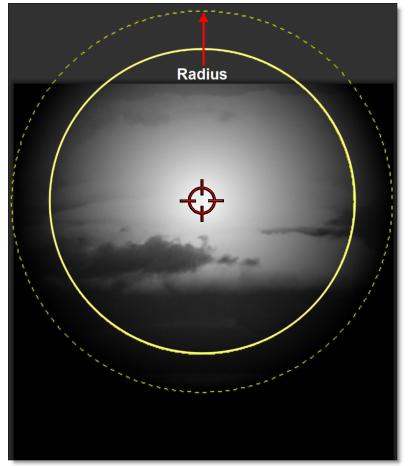 In addition to using the slider controls in the Toolbar, the Position, Range and Radius parameters can be set using on-screen controls. Click on the image to place the on-screen control which consists of a center point and a solid circle. The Position value is set by the location of the center point, while the Range is set by sizing the circle. The larger the circle, the larger the range.