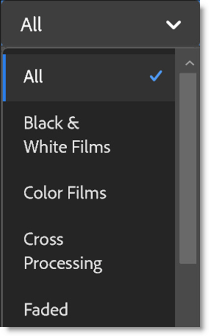 Some filters contain multiple preset groups which are selectable at the top left of the Presets window.